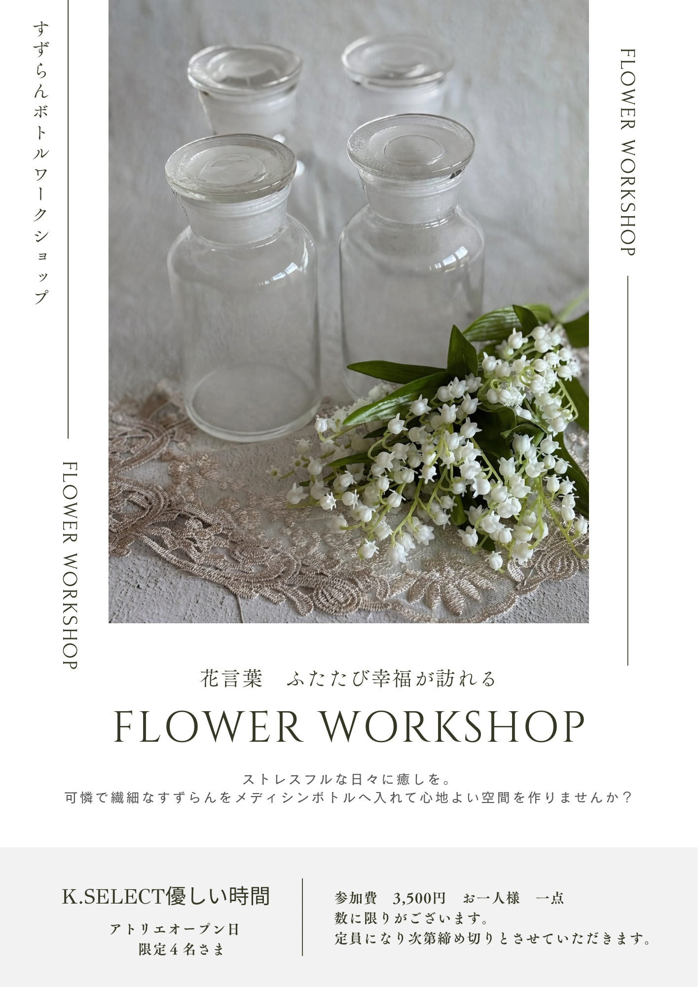 可憐で繊細な花すずらん 花言葉は「ふたたび幸福が訪れる」 そんな可愛いすずらんのアーティフィシャルフラワーをメディシンボトルへ入れて作るボトルフラワーです。 余白を感じさせるシンプルでおしゃれな ボトルフラワーを作れます。 メディシンボトルの数に限りがありますので限定4名さまとさせていただきます。 初めての方でも、サポートしますので安心してご参加いただけます。